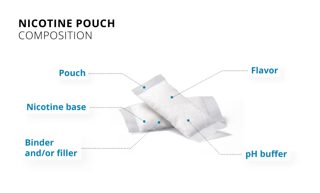 Πρώτα από όλα περιέχει σε μορφή άλας κρυσταλλωμένη νικοτίνη, που προέρχεται από ειδική επεξεργασία του φυτού Nicotiana Tabacum και δεν έχει ίχνος καπνού. Αρωματικές ύλες που είναι υπεύθυνες για την μεγάλη παλέτα γεύσεων που προσφέρουν τα σακίδια νικοτίνης , προκαλώντας τις αισθήσεις των χρηστών. Η μέντα είναι αυτή που κρατάει την πρωτοκαθεδρία και ακολουθούν γεύσεις λουλουδιών, βοτάνων, φρούτων ή συνδυασμός αυτών. Φυτικές ίνες που γεμίζουν το σακίδιο ώστε να αποκτήσει μια ευχάριστη υφή και να τοποθετείται ευχάριστα στο στόμα. Ρυθμιστές PH. Είναι χρήσιμοι για την ρύθμιση του pH αφού η οξύτητα ή η αλκαλικότητα επιδρούν στην ένταση της νικοτίνης. Η απορρόφηση της νικοτίνης είναι ευαίσθητη στο pH, οπότε επιβάλλεται ο έλεγχος της για να ρυθμιστεί η ένταση νικοτίνης. Σημαντικό να τονίσουμε εδώ, πως κάποια προϊόντα με υψηλό pH, περιλαμβάνουν υψηλούς δείκτες ανθρακικού νατρίου και χρήζουν προσοχής αν γίνεται συστηματική χρήση.